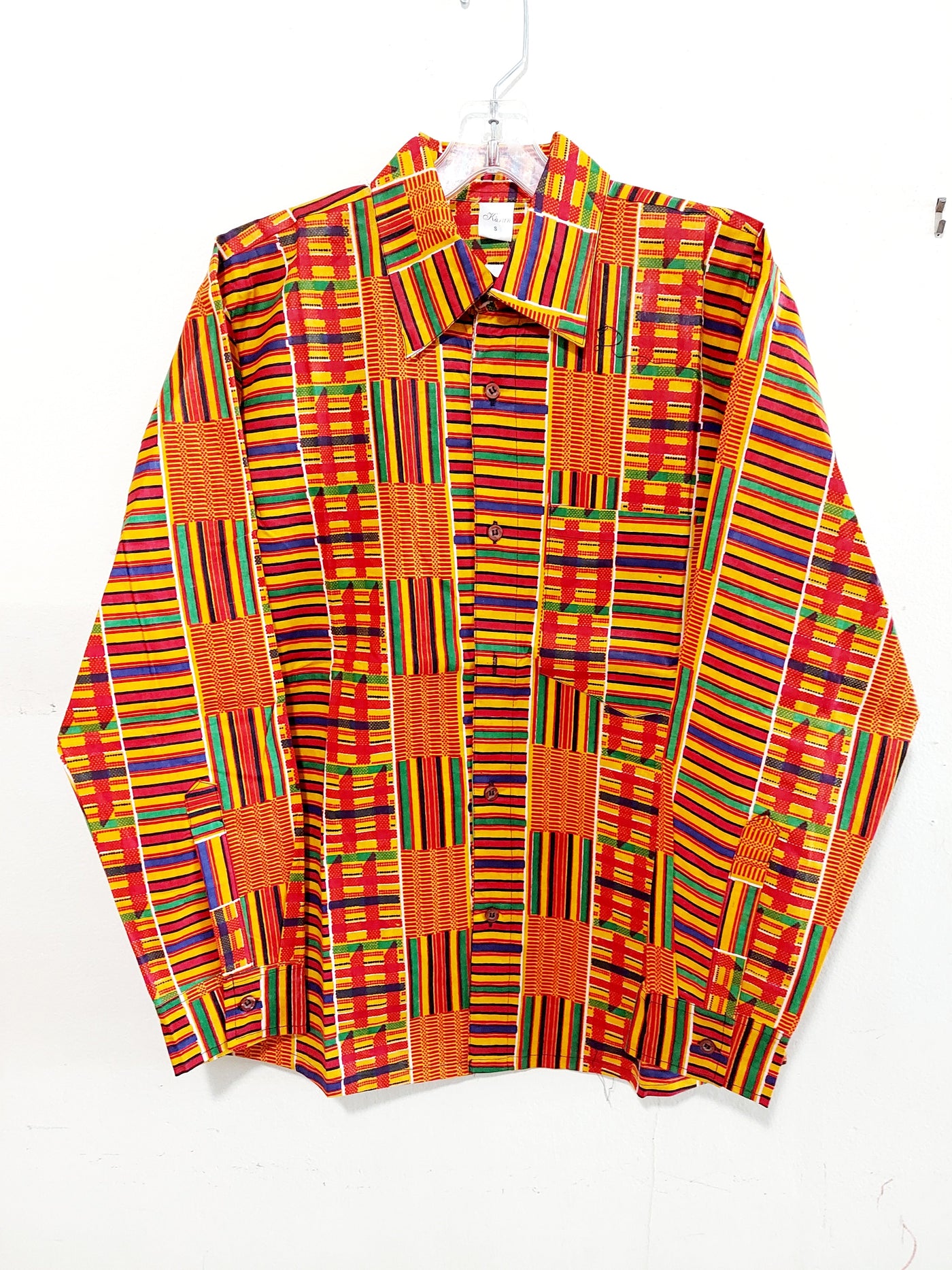 Men African Print Button Down Shirt/ Long Sleeve- Yellow Kente 65 - XXLarge