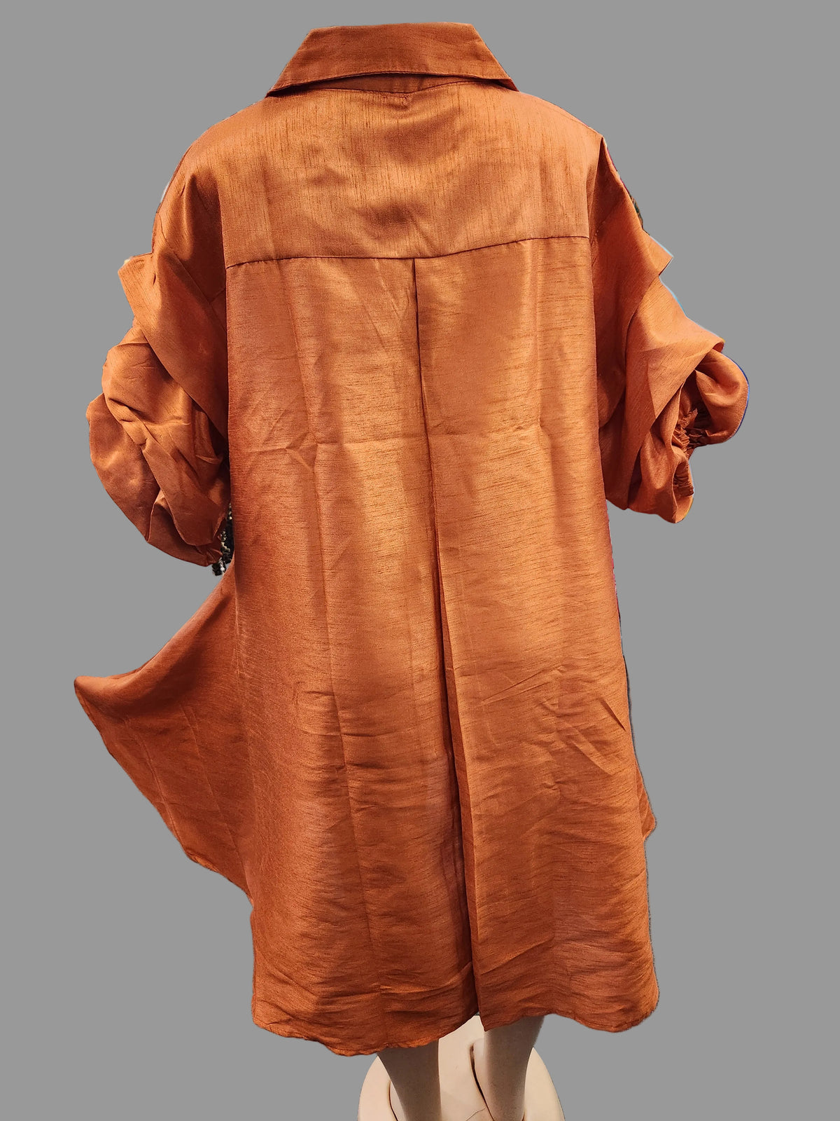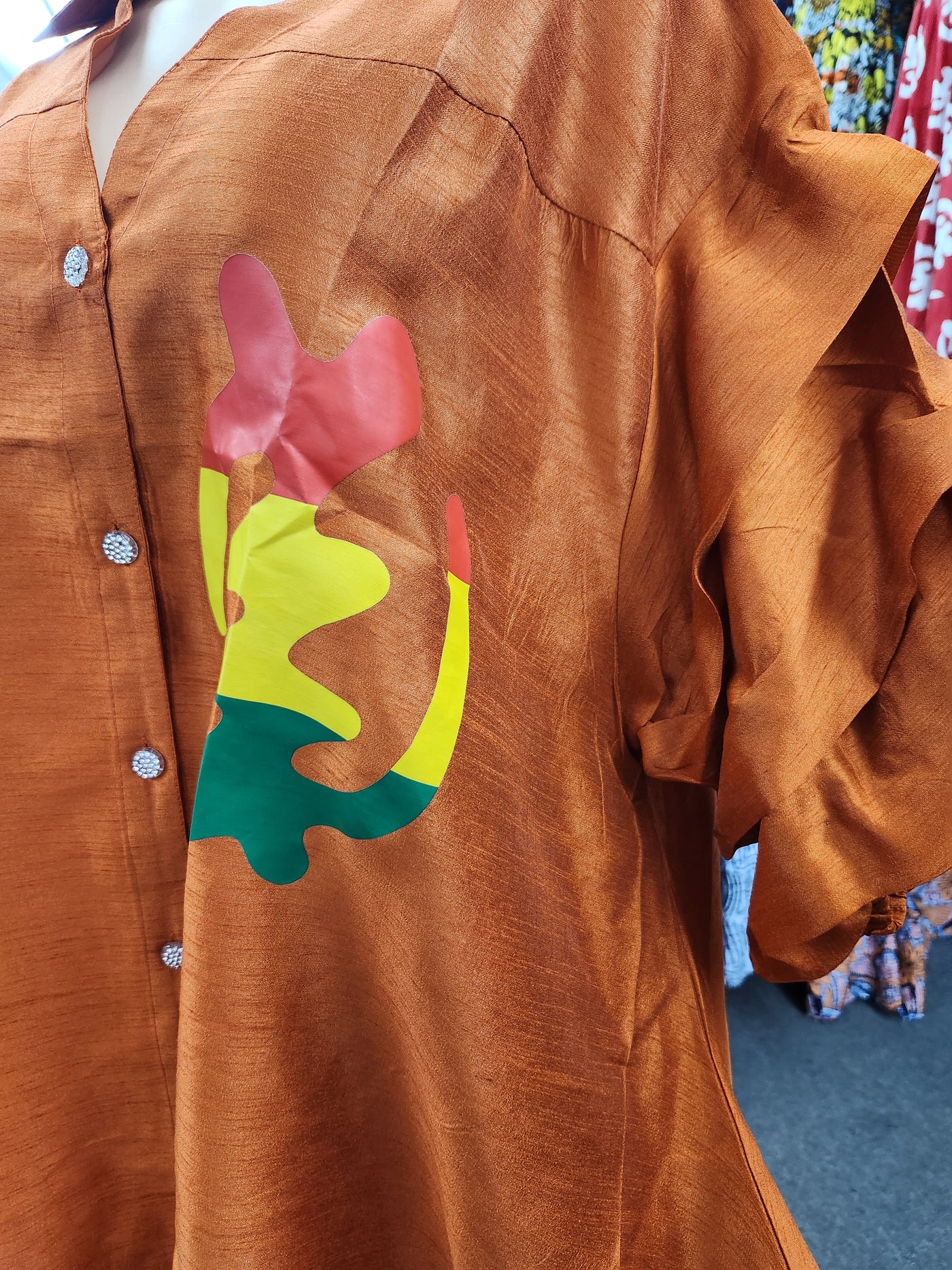 Swing Dress/ Faux Silk/ Ruffle Sleeve With Gyname Decal 758G Rust Orange - Rasta (red.yellow.green) decal